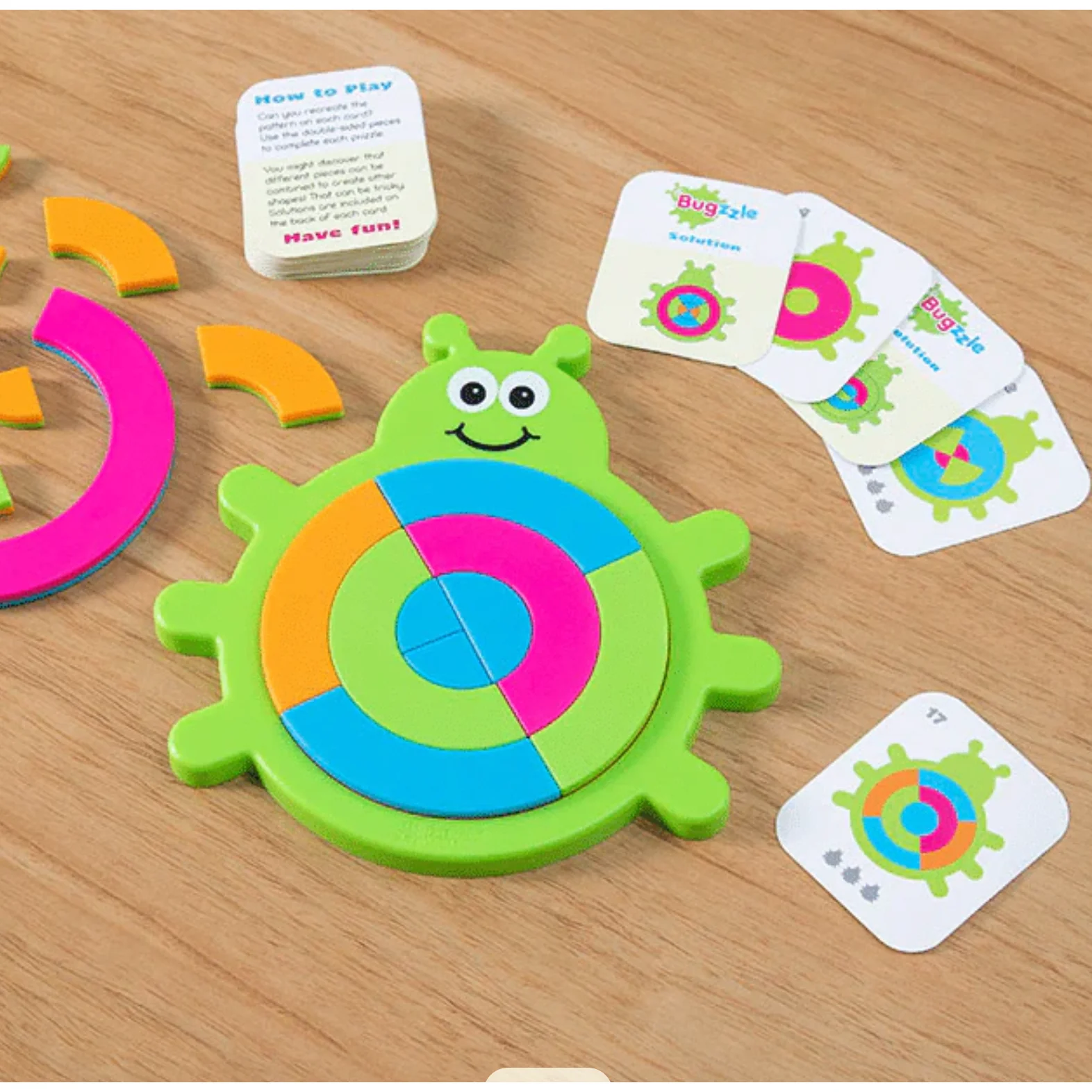 Children pick one of the 40 challenge cards and then arrange, flip, and perfectly position the semi-circular puzzle pieces into the bug-shaped tray to match the picture.
